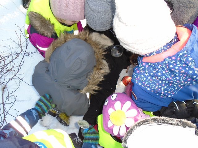 Hvort sem er vetur eða sumar, vor eða haust, fara börnin út í skóginn til að læra og upplifa. Börn sem ekki eru sterkust inni við geta orðið forystufólk þegar komið er út undir bert loft. Ljósmynd: Anna Gína Aagestad