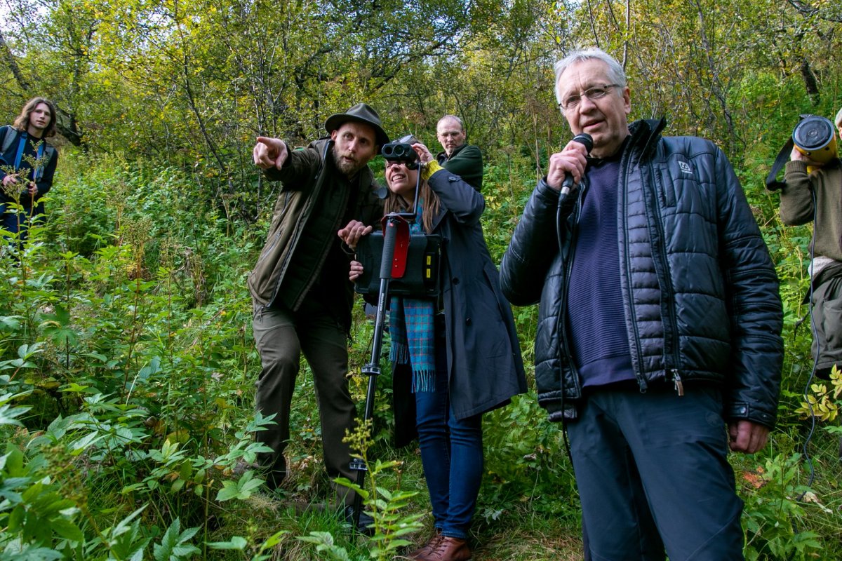 Björn Traustason, fagstjóri landupplýsinga hjá Skógræktinni, leiðbeinir Katrínu Jakobsdóttur forsætisráðherra við mælinguna á hæsta tré landsins. Jónatan Garðarsson, formaður Skógræktarfélags Íslands, hægra megin með hljóðnemann, lýsir fyrir gestum því sem gerist og Hreinn Óskarsson, sviðstjóri þjóðskóga hjá Skógræktinni, fylgist með að baki. Ljósmynd: Pétur Halldórsson