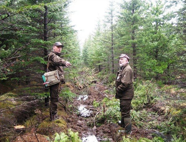 Föstudaginn 16. maí skoðuðu nokkrir starfsmenn Skógræktar ríkisins útkomu grisjunar með grisjunarvél (Græna Drekanum) í Haukadalsskógi. Grisjað var með vélinni síðsumars 2007 og vorið 2008 í blönduðum sitkagreni og stafafuruskógi sem gróðursettur var í framræst og plægt land 1967. Ýmsir erfiðleikar komu fram í sambandi við notkun grisjunarvélarinnar á þessum stað, sem verða þó ekki tíundaðir hér. Það sem máli skiptir er að hér fæst dýrmæt reynsla sem nýtast mun við ákvarðanatöku um grisjun annarsstaðar. Á myndinni eru Þorbergur Hjalti Jónsson skógarvörður og Jón Loftsson skógræktarstjóri að skoða grisjaða svæðið. Sjá má að blautur jarðvegur var meðal vandamálanna.