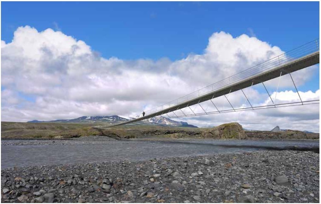 Tölvugerð mynd af vinningstillögunni þar sem ráðgert er að hún verði lögð yfir Markarfljót við Húsadal á Þórsmörk.