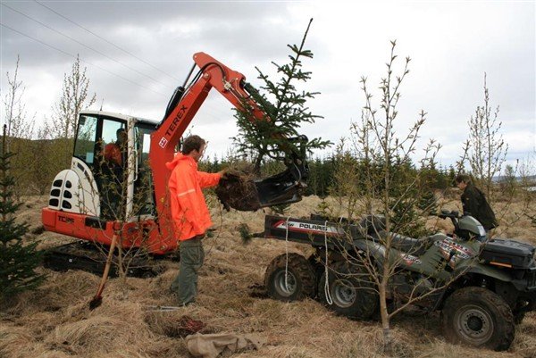 Á myndin sjást starfsmenn Skógræktarinnar á Vesturlandi að vinna við að taka upp sitkagreni á Stóru-Drageyri í Skorradal og nota til þess léttar vélar sem komast um landið án þess að skemma það. Þannig nýtist taka hnausplantna vel sem grisjun því menn eru ekki bundnir við að taka eingöngu tré nálægt vegum.