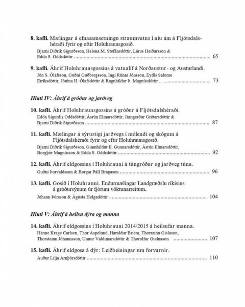 Í þessu hefti er gerð grein fyrir meginniðurstöðum úr mörgum þeim vöktunar- og umhverfisrannsóknum þar sem reynt var að meta áhrif eldgossins í Holuhrauni á umhverfi og heilsu. Ljóst er að áhrif eldgossins í Holuhrauni á eðlis- og efnafræðilega eiginleika umhverfisins hafa verið talsverð og líklega meiri en margan grunaði. Niðurstöðurnar sýna að eldfjallagas frá gosinu hafði mælanleg áhrif á umhverfisaðstæður hérlendis þrátt fyrir að atburðurinn hafi átt sér stað á hálendi Íslands, að vetri til og fjarri mannabústöðum.