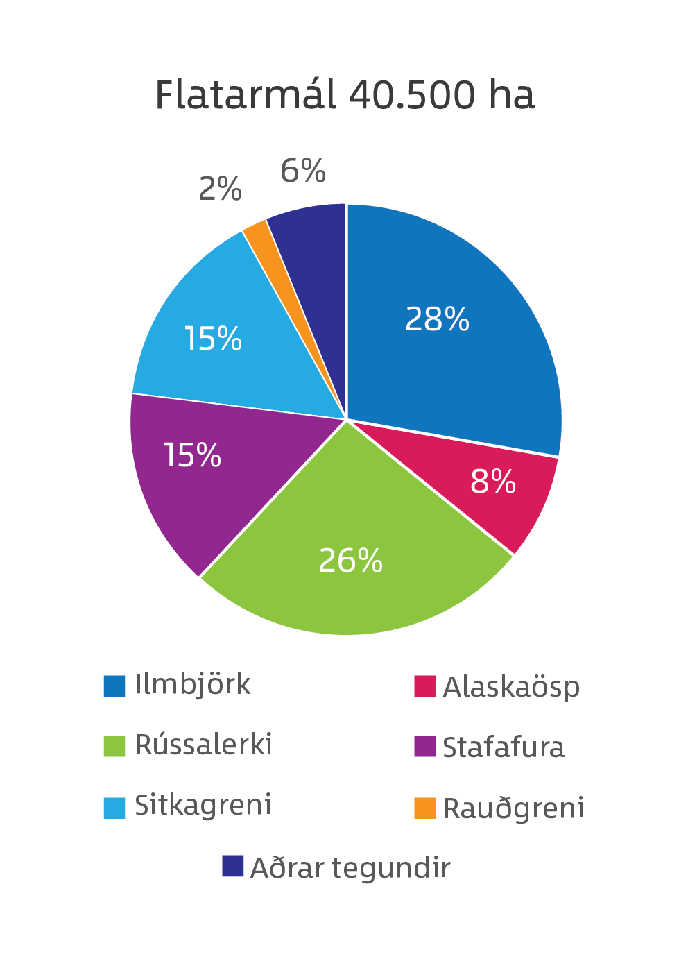 Heildarflatarmálið skiptist þá niður á milli helstu trjátegunda eins og efri myndin hér fyrir neðan sýnir: