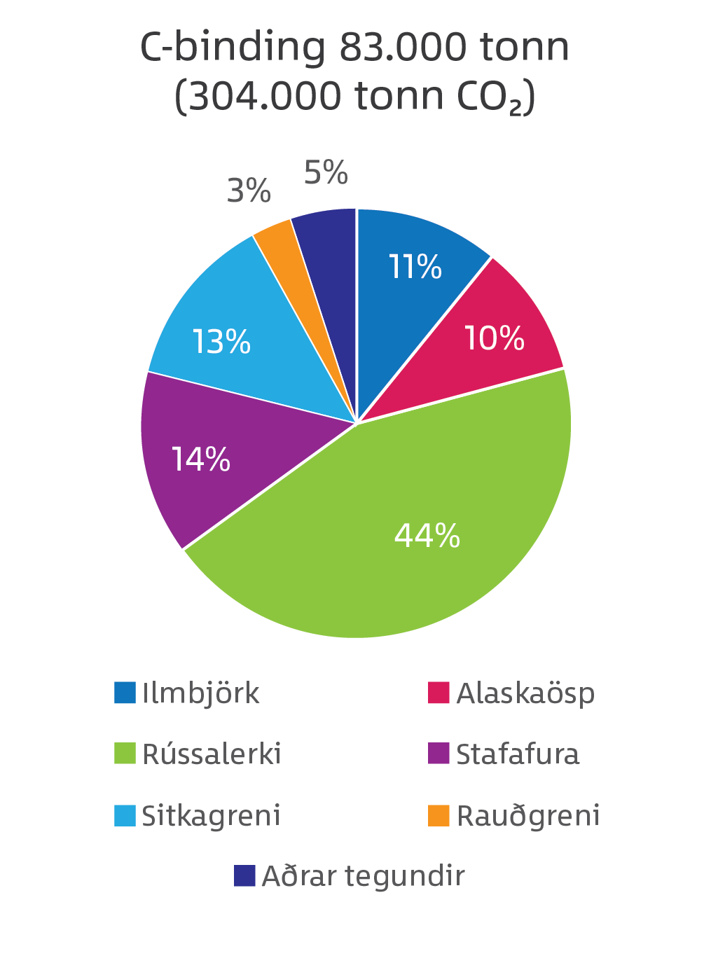 Samanlögð kolefnisbinding var metin 304 kílótonn CO2 (± 30 kt (95% vikmörk)) og skiptist hlutfallslega á milli ríkjandi trjátegunda eins og myndin hér fyrir neðan sýnir: