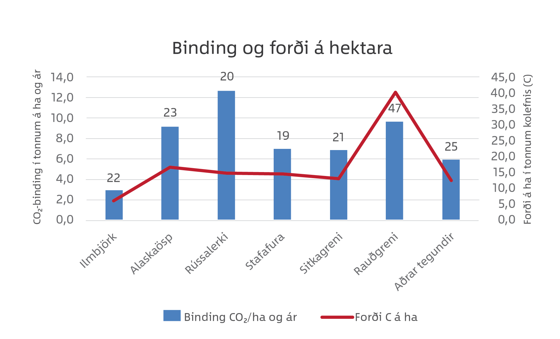 Ef skoðuð er árleg CO2-binding og kolefnisforða í trjám á hektara kemur í ljós nokkuð óvænt að rússa-/síberíulerki hafði vinningin varðandi árlega bindingu en rauðgreni hefur mestan forða sem skýrist að hluta af því að meðalaldur rauðgrenisskóganna er mun meiri en hinna tegundanna. Meðalaldur er sýndur fyrir ofan súlu hverrar trjátegundar:Binding og forði á hektara