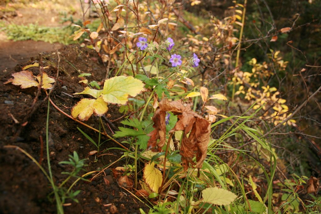 Einstök hausthlýindi hafa verið á landinu og þessa dagana er enn ágætis sumarhiti. Í skógum sjást enn blómstrandi jurtir s.s. vallhumall, blágresi og ýmsir fíflar. Reyniviðir á Suðurlandi hafa borið góðan ávöxt í sumar og sjást tré af öllum stærðum nú hlaðin rauðum berjum og í sumum tilfellum eru greinar sligaðar af berjunum. En þó nú sé komið fram í október og haustlitir í algleymingi virðist reyniviðartré eitt í Laugarvatnsskógi ekki fylgja árstíðunum. Reyniviður sem stendur í vegarbrún gamla vegarins upp á Lyngdalsheiði blómstrar þessa dagana þó hann sé að öðru leyti kominn í haustbúning. Ekki hafa fengist neinar góðar skýringar á af hverju reyniviðurinn hagar sé svona, en líklegast er þó að sumarið sé orðið það langt að síðsumarsprotar hafi í sumarhitum myndað blómbrum sem svo hafi farið af stað í hlýindunum í haust. Nú þegar fer að kólna meira á næstu vikum munu þessi blóm vænanleg frjósa og ekki má vænta berja af þeim. Myndir nar að neðan sýna blómstrandi reynivið í haustlitunum og sú að ofan blágresi í Þjórsárdal.