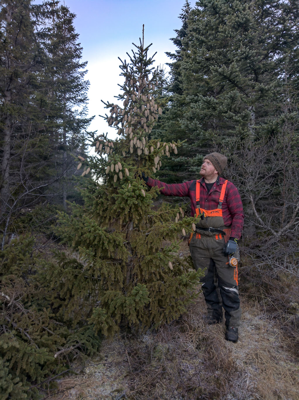 Hallþór skógarhöggsmaður við myndarlegt torgtré úr þjóðskógum Vesturlands. Hæsta tréð sem tekið var í ár mældist 11,5 metrar. Ljósmynd: Jón Auðunn Bogason