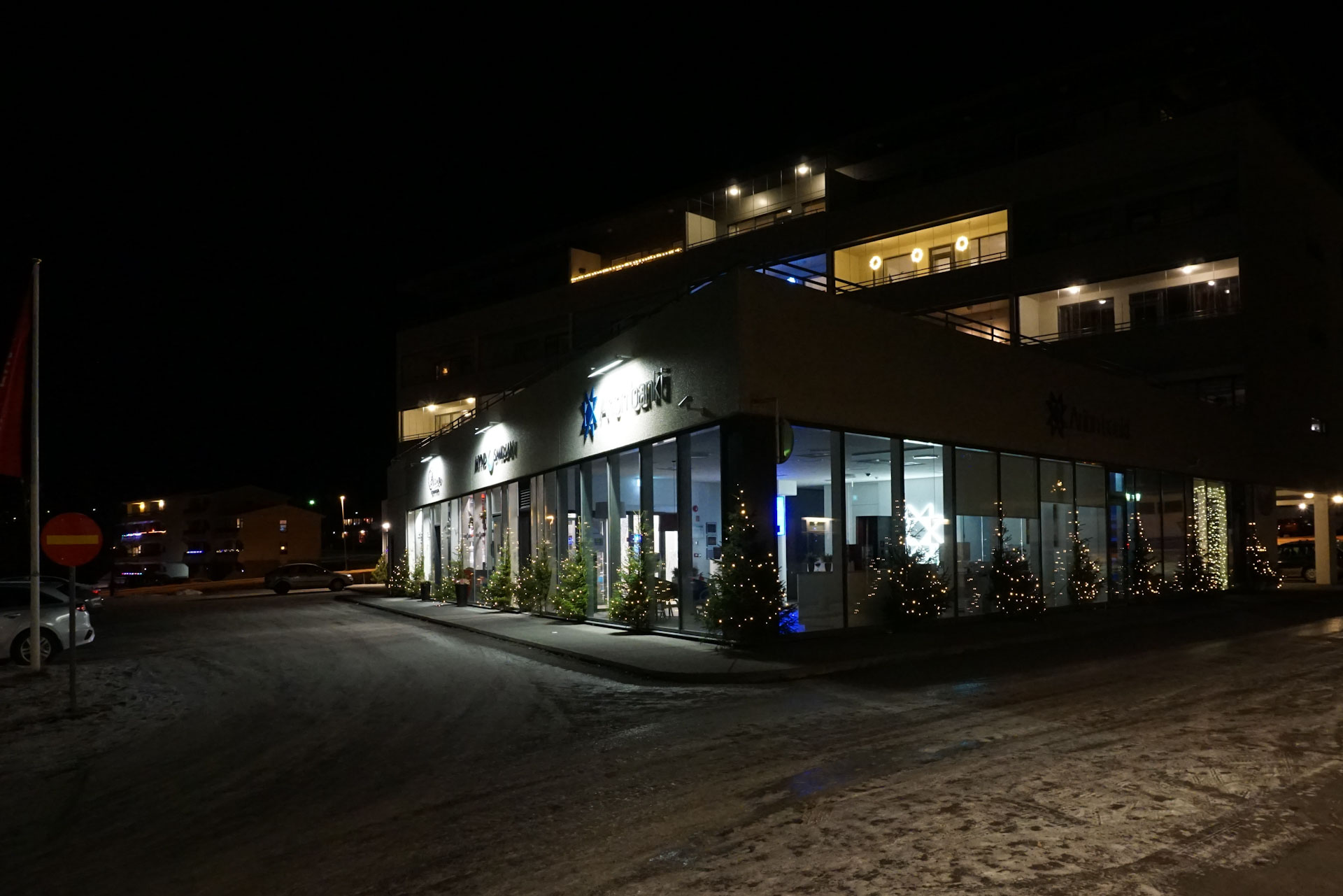 Veggtré við Miðvang 2-4 á Egilsstöðum. Þar upphófst sá siður fyrir mörgum árum að setja tré sem voru ber öðrum megin upp við húsveggi. Þannig geta tré orðið jólatré sem hafa staðið þétt upp við önnur tré í skóginum og eru því ekki falleg allan hringinn. Slík tré fengu hið virðulega heiti veggtré og slík njóta nú vaxandi vinsælda við verslanir og önnur fyrirtæki á Egilsstöðum. Ljósmynd: Bergrún Arna Þorsteinsdóttir.