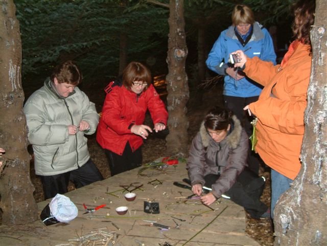 Settar voru upp þrjár stöðvar: Á þeirri fyrstu, Ull og ævintýri, varunnið með ull og efni úr skóginum um leið og Auður Óskarsdóttir sagði ævintýri. Á annari stöð var farið í gegnum útieldun með jólabragði sem Helena Óladóttir sá um. Á þeirri þriðju sýndi Ólafur Oddsson, fræðslufulltrúi Skógræktar ríkisins, hvernig má nota grannt og grænt (ferkst) skógarefni til að búa til jólaskraut, skartgripi og vindhörpur. Í verkefnin voru notaðir árssprotar af víði, ösp, reynivið og birki. Einu áhöldin sem notuð voru, voru greinaklippur og litlir handborar, auk blómavírs og leðurreima. Námskeiðið var fullbókað og komust færri að en vildu.