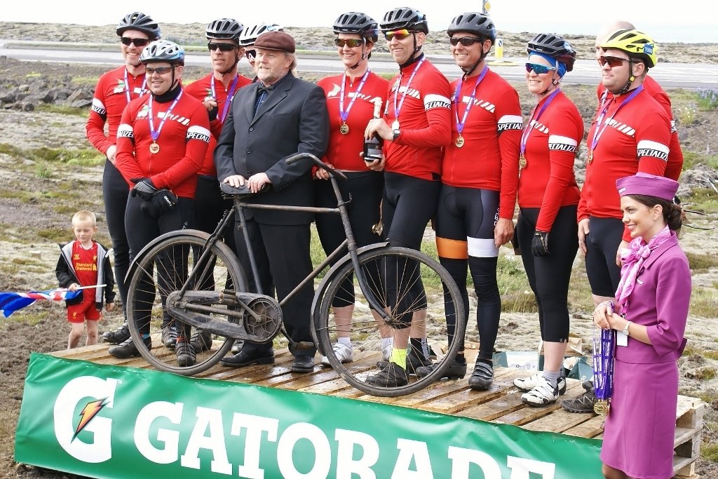 Lið Skógræktarinnar á verðlaunapalli ásamt skógræktarstjóra, flugfreyju og óþekktum ungum aðdáanda. Hjól fyrsta skógrækarstjórans í forgrunni. Mynd: Halldór Sverrisson.