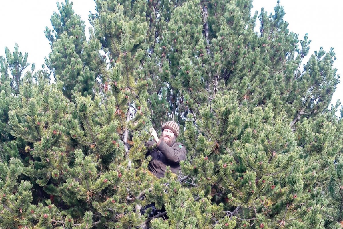 Valdimar Reynisson hátt uppi í stafafurutré að tína köngla. Ljósmynd: Sæmundur Þorvaldsson