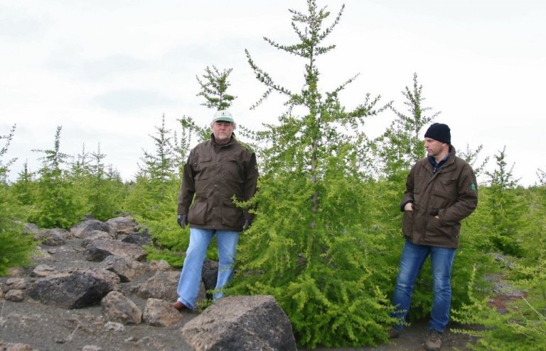 Þröstur og Brynjar standa hér við myndarleg lerkitré sem vaxið hafa hjálparlaust upp úr grýttum mel á Hólasandi. Þótt mörg trjánna séu margstofna og bækluð af harðri lífsbaráttunni á sandinum eru líka mörg bein og ekki síður efnileg en víða er í skógum landsins.