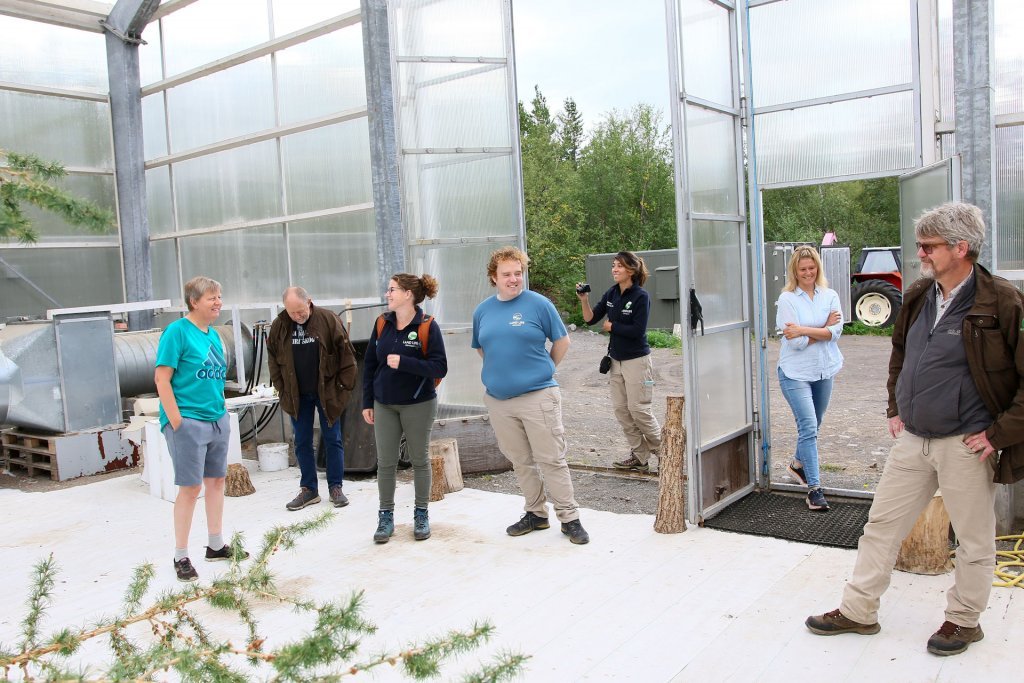Litið inn í Fræhúsið á Vöglum í Fnjóskadal þar sem fer fram fræframleiðsla á lerkiblendingnum Hrym og ýmsar tilraunir sem snerta plöntugæði, fjölgun trjáplantna og plöntukynbætur. Frá vinstri: Valgerður Jónsdóttir, Þröstur Eysteinsson, Willemijn Stoffels, Robert van Schooten, Kathleen Ceulemans, Rakel Jónsdóttir og Aðalsteinn Sigurgeirsson. Ljósmynd: Pétur Halldórsson