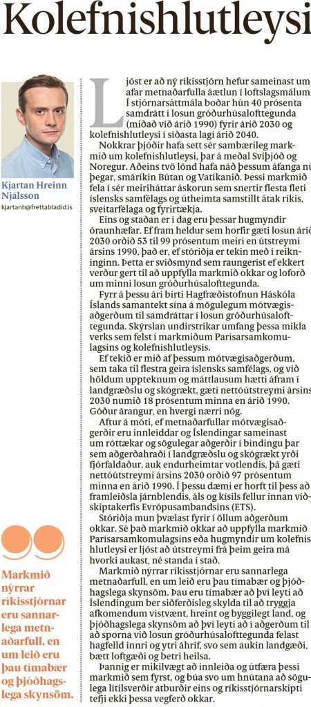„Ef tekið er mið af þessum mótvægisaðgerðum, sem taka til flestra geira íslensks samfélags, og við höldum uppteknum og máttlausum hætti áfram í landgræðslu og skógrækt, gæti nettóútstreymi ársins 2030 numið 18 prósentum minna en árið 1990. Góður árangur, en hvergi nærri nóg,“ skrifar Kjartan Hreinn. Leiðari hans er annars á þessa leið:
