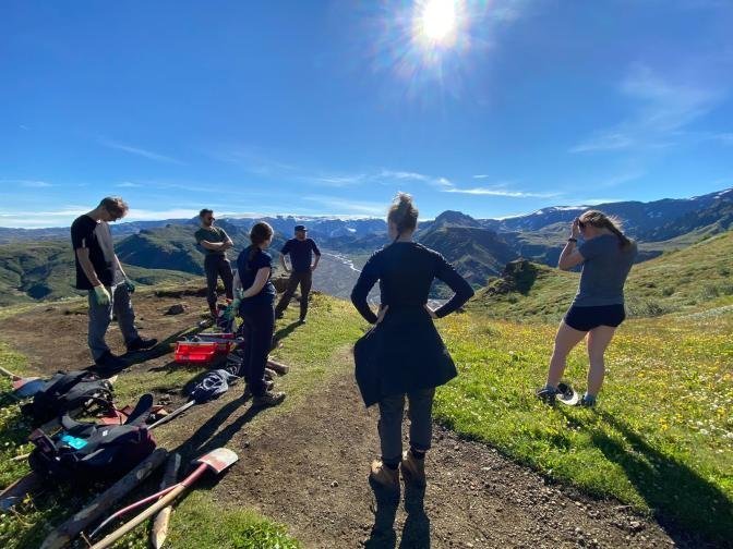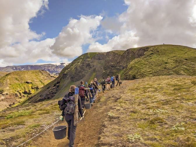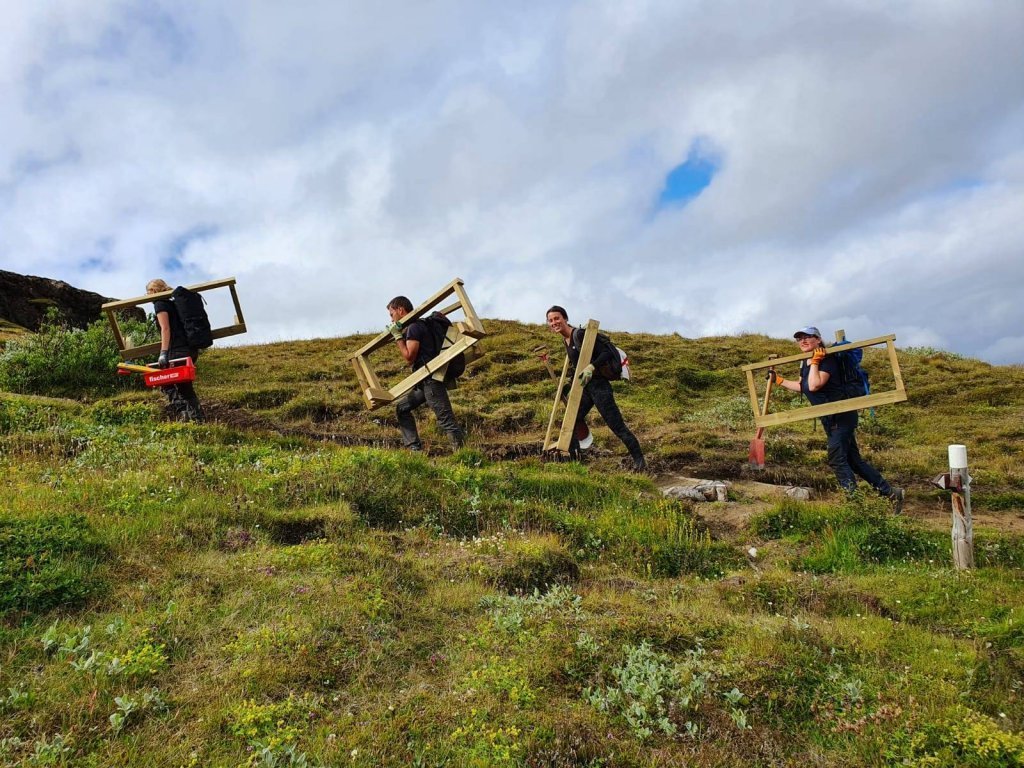 Kampakátir sjálfboðaliðar leggja upp frá starfstöð Skógræktarinnar í Langadal með efnivið í tröppur í hlíðum Valahnúks. Ljósmynd: Anna Mariager/Trailteam.is