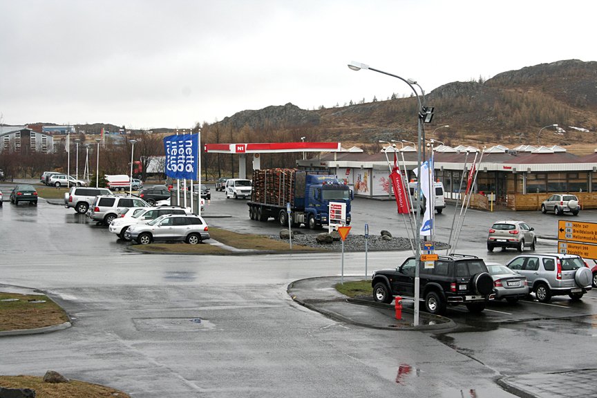 Starfsfólk á aðalskrifstofu Skógræktar ríkisins og Héraðs- og Austurlandsskóga á Egilsstöðum kættist þegar þessi sjón blasti við þeim út um skrifstofugluggana. Þarna var á ferðinni flutningabíll hlaðinn 40 rúmmetrum af lerkibolum úr Hafursárskógi á leið til Elkem á Grundartanga.