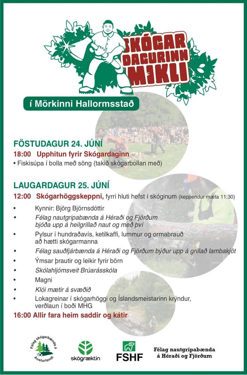 Auglýsing fyrir Skógardaginn miklaUpphitun hefst reyndar fyrir Skógardaginn mikla kl. 18 á föstudagskvöld þegar í boði verður fiskisúpa í Mörkinni Hallormsstað og efnt til söngs. Fólk er beðið að koma með skógarbollann með til að fá súpu í og svo geta allir tekið þátt í söngnum. Á laugardag verða hefðbundin atriði á Skógardeginum mikla með matarveislu, Íslandsmóti í skógarhöggi, leiki, þrautum, tónlist og skemmtun þar sem Magni kemur meðal annars fram.