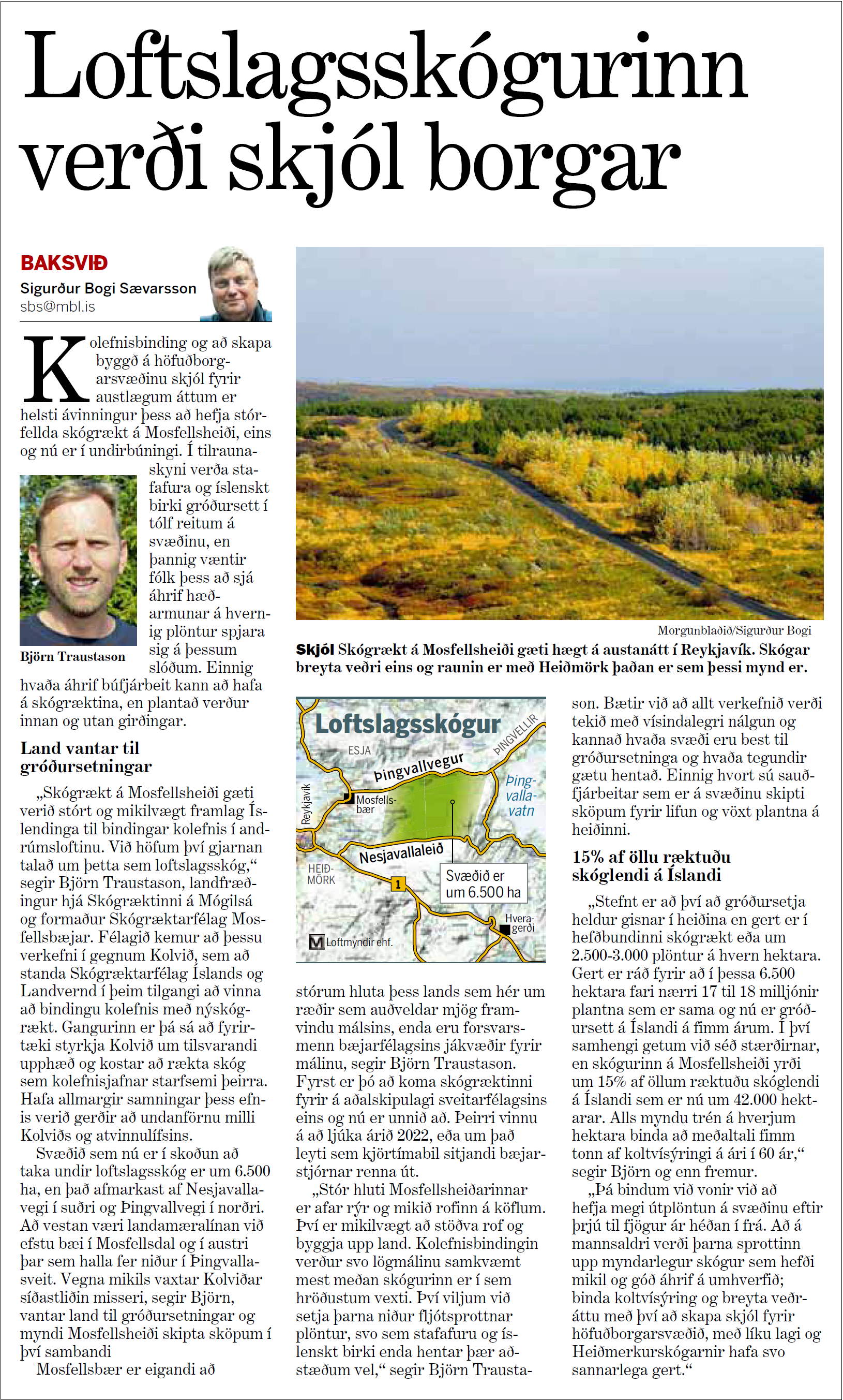 Sigurður Bogi Sævarsson blaðamaður ræðir við Björn og í upphafi umfjöllunarinnar kemur fram að helsti ávinningur þess að hefja stórfellda skógrækt á Mosfellsheiði, eins og nú er í undirbúningi, sé annars vegar kolefnisbinding og hins vegar að skapa byggð á höfuðborgarsvæðinu skjól fyrir austlægum áttum.