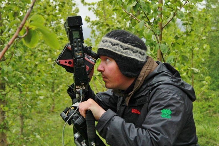 Bjarki horfir í halla- og fjarlægðarmælinn til að finna út hæð trjánna.