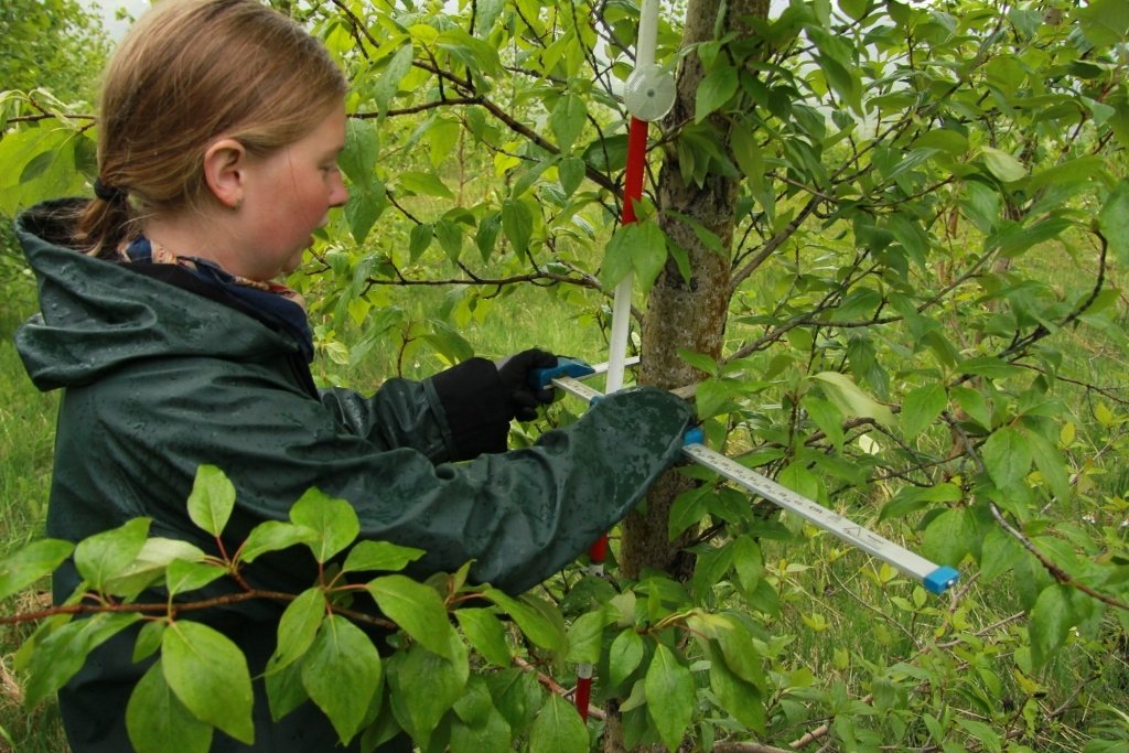Á mælistikunni sem Kajsa stendur við er endurskin sem tækin nema til að sannreyna m.a. staðsetningu trésins miðað við punktinn í mælifletinum.">