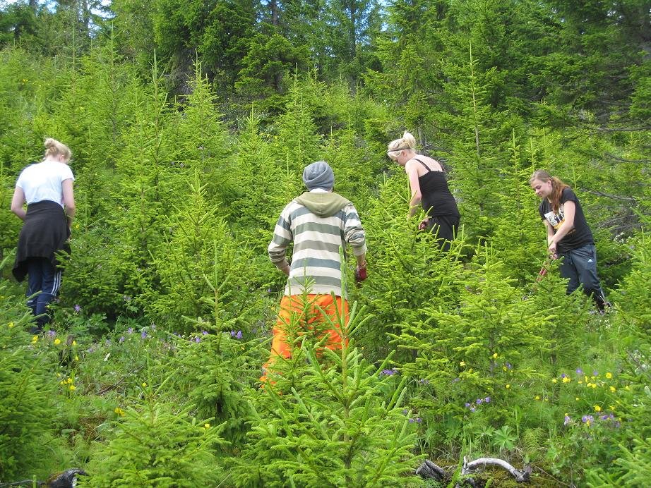 Síðustu ár hefur Skógrækt ríkisins fengið aðstoð við ýmis verkefni í þjóðskógunum frá sumarvinnuhópum Landsvirkjunar, Margar hendur vinna létt verk. Hefur samstarfið gengið ágætlega og hafa unglingarnir unnið við stígagerð, gróðursetningu og fráklippingu í skógunum. Á meðfylgjandi myndum sést unglingahópur úr Búrfellsstöð klippa frá rauðgreni í Þjórsárdalsskógi. Skógræktarmenn vilja þakka Landsvirkjun fyrir gott samstarf.