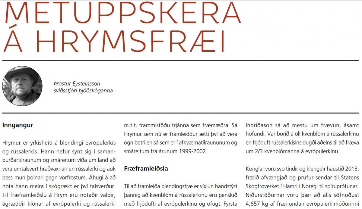 Með öðrum orðum megum við eiga von á að þau tré sem vaxa upp af því mikla fræi sem uppskorið var í fyrra verði enn öflugri en fyrstu Hrymtrén. Um 20.000 plöntur voru afhent úr gróðrarstöðvum 2012 af fræi úr fyrstu uppskeru þessa nýja Hryms og svipað magn 2013. Lítið var hins vegar afhent nú í vor sem helgast af lélegri blómgun vorið 2012.