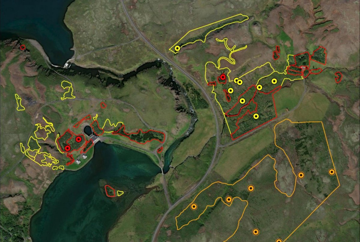 Hluti kortlagningar af skógum Landsvirkjunar við Sogsstöðvar, eldri skógar merktir með rauðu. Brot a…