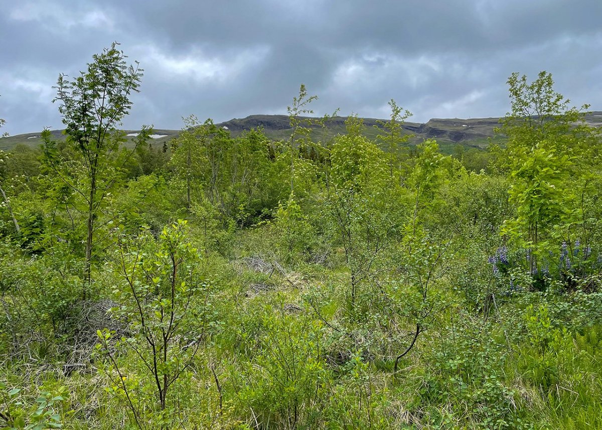 „Ef ætlunin er að rækta skóg einhverra annarra tegunda efir fellingu lerkiskógar er rétt að hafa hraðan á við gróðursetningu því fyrr en varir mun náttúran annars sjá um að rækta sinn eigin skóg,“ skrifar skógræktarstjóri. Myndina tók hann á gömlum örfoka mel sem lerki græddi upp en er nú að breytast af sjálfu sér í fjölbreyttan blandskóg eftir að lerkið var fellt
