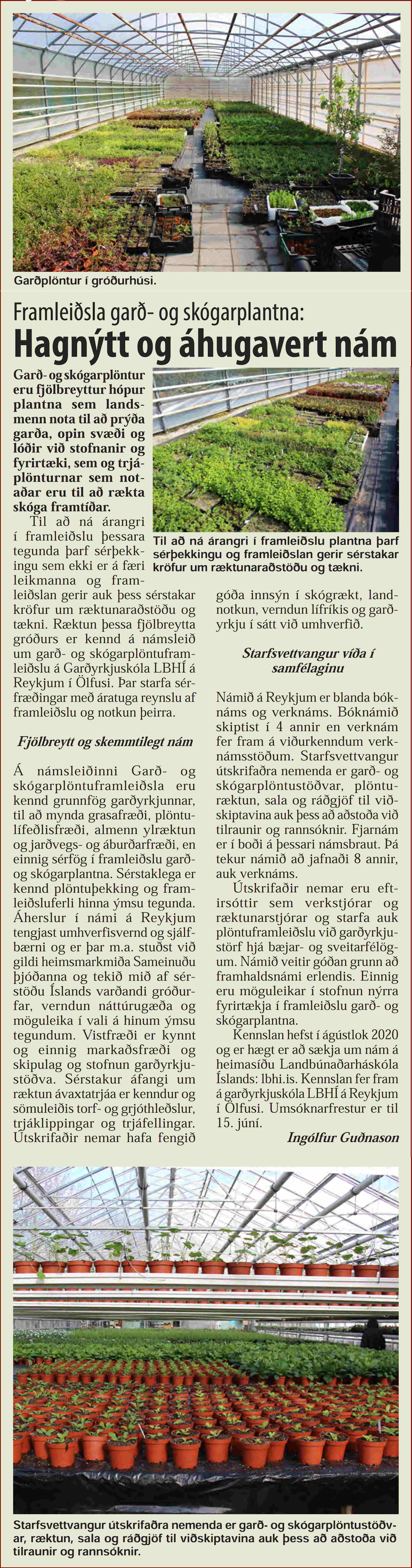 Ingólfur Guðnason skrifar í Bændablaðið um hagnýtt og áhugavert nám sem er í boði við Garðyrkjuskóla LbhÍ á Reykjum í Ölfusi. Þetta er fjögurra anna bóklegt og verklegt nám í framleiðslu garð- og skógarplantna. Sækja má um þetta nám til 15. júní en það hefst í lok ágúst.