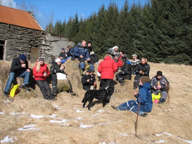 Á meðfylgjandi mynd er hluti hópsins að borða nestið sitt við gamla bæinn á Stálpastöðum.