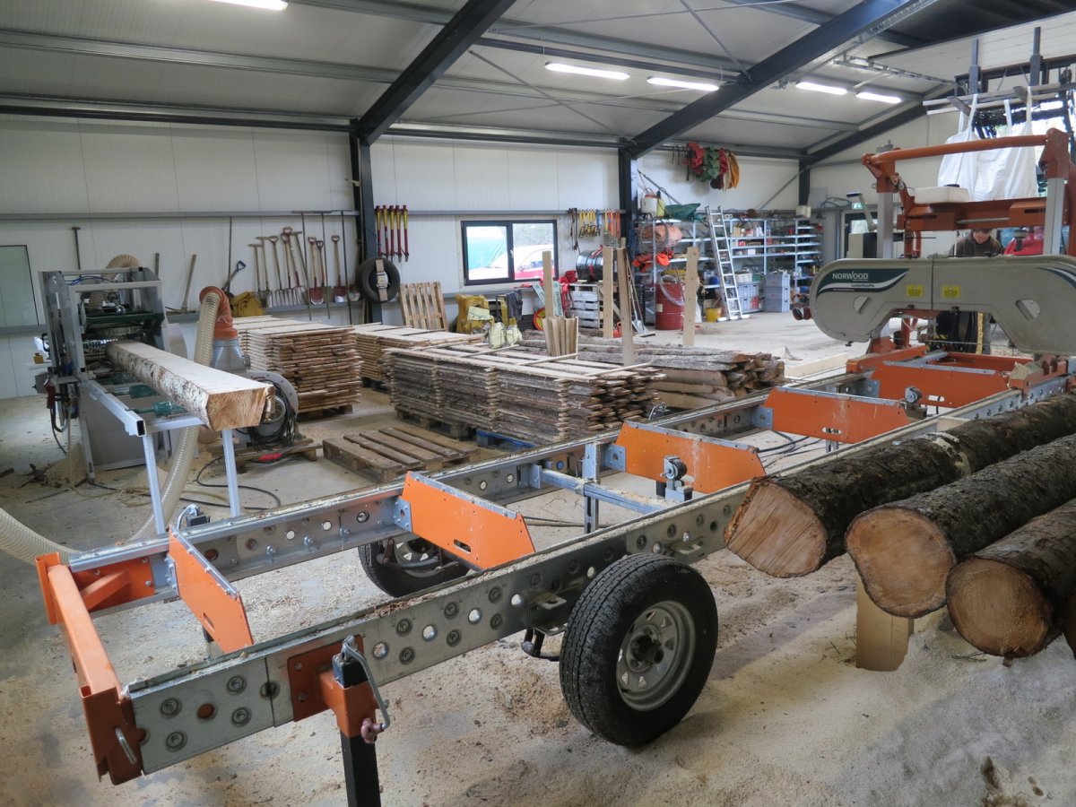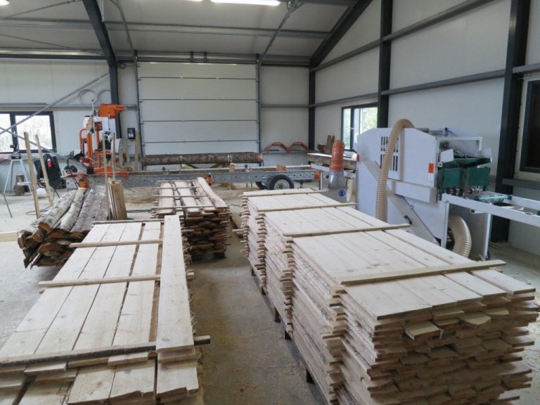 Í maímánuði voru sagirnar settar upp í skemmunni, báðar af gerðinni Logosol. Annars vegar er bandsög sem sagað getur svera boli eftir endilöngu og hins vegar svokölluð tifsög sem sagar allt að 18 sm svera stokka í mismunandi þykka planka og borð. Jóhannes H. Sigurðsson, aðstoðarskógarvörður á Suðurlandi og staðarhaldari í Þjórsárdal, segir að úr sverustu bolunum sem teknir eru úr skóginum fáist gjarnan nokkrar gerðir af smíðaefni. Stundum sé til dæmis tekið fyrst ofan og neðan af bolnum og fást tvö bök, fjalir með berki öðrum megin. Síðan megi taka t.dl tvö óköntuð 19 mm þykk klæðningarborð hvorum megin eða þar til stamminn innst í bolnum er kominn í rétta stærð fyrir tifsögina.