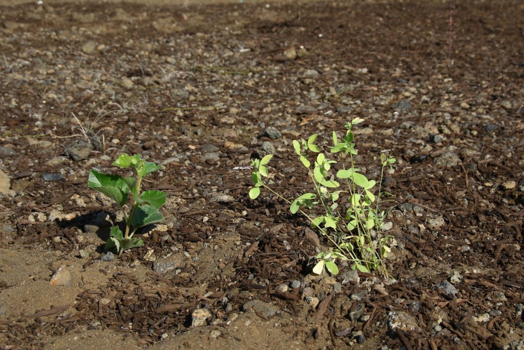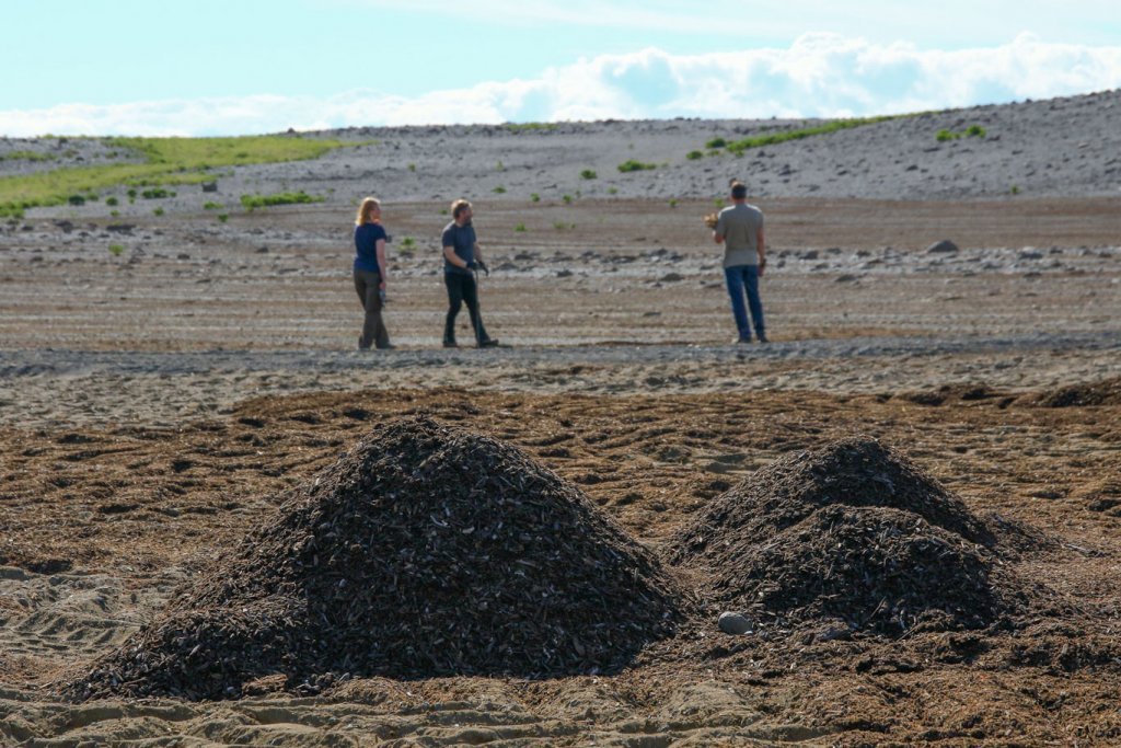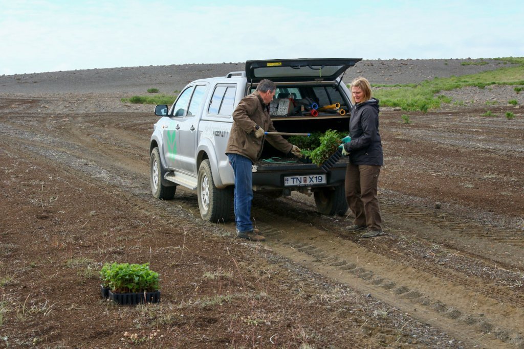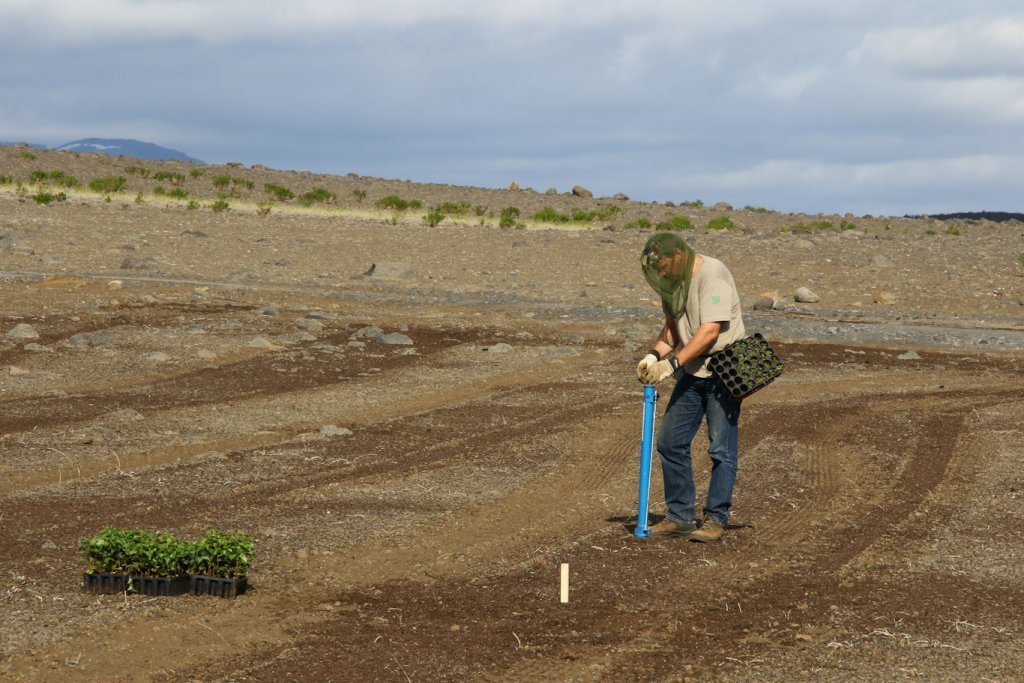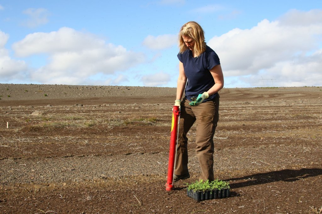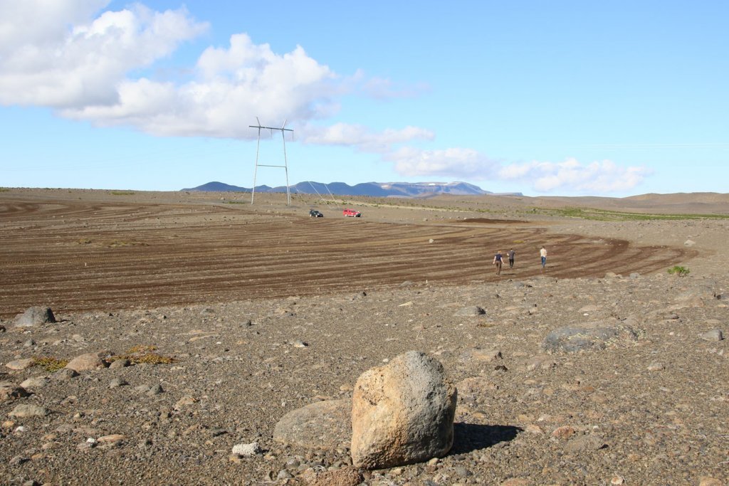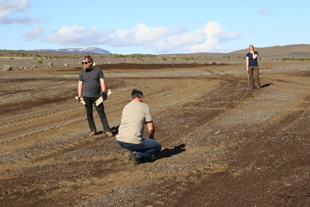 Meðfylgjandi myndir voru teknar 25. og 26. ágúst þegar unnið var að því að setja tilraunina út. Þær sýna tilraunasvæðið á Hólasandi þar sem dreift hafði verið moltu. Tilraunin var sett út í afmarkaða reiti með blöndu af belgjurtategundunum sjö og birki. Í hvern reit fóru 200 birkiplöntur og um 70 belgjurtaplöntur.