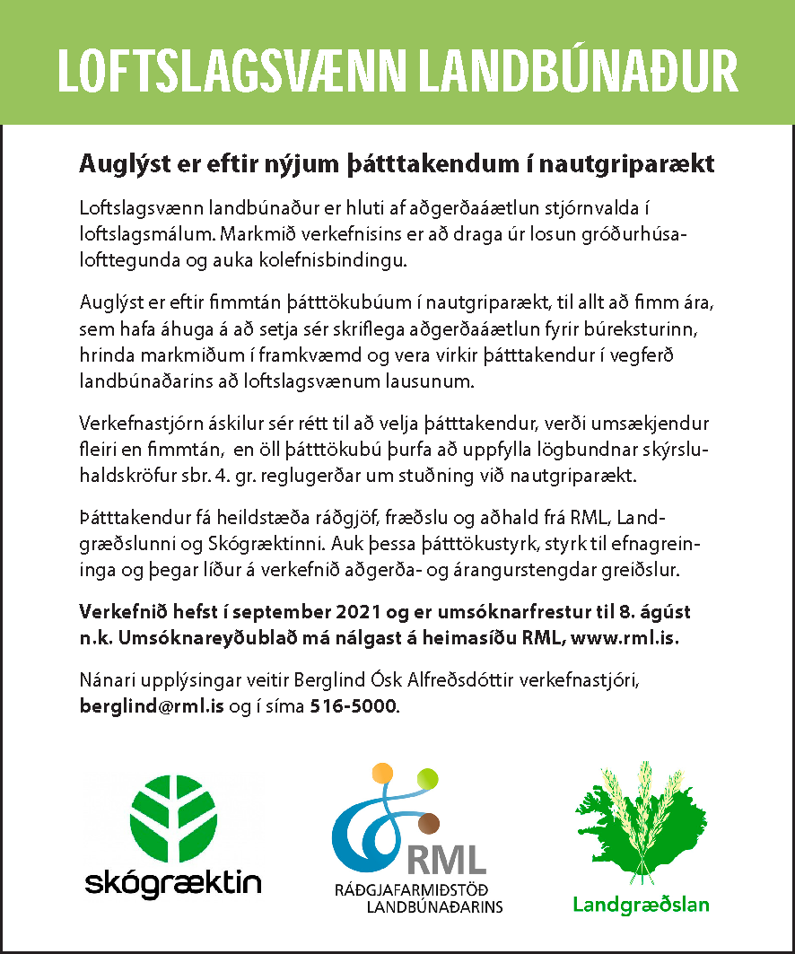 Þátttakendur í Loftslagsvænni landbúnaði gera skriflega aðgerðaáætlun fyrir búreksturinn, hrinda loftslagsmarkmiðum í framkvæmd og eru virkir þátttakendur í vegferð landbúnaðarins að loftslagsvænum lausunum. Þátttakendur fá heildstæða ráðgjöf, fræðslu og aðhald frá RML, Landgræðslunni og Skógræktinni. Auk þess fá þau þátttökustyrk, styrk til efnagreininga og þegar líður á verkefnið aðgerða- og árangurstengdar greiðslur.