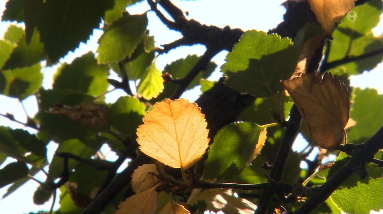 Laufblöð sem eru orðin alveg brún af völdum birkiþélu. Skjámynd úr frétt RÚV„Hérna sjáið þið til dæmis sýkt lauf sem eru orðin brún. Þetta fer að sjást um miðjan ágúst. En ef þið sjáið svona sýkt lauf á vorin eða um miðjan júní þá er það birkikemban.