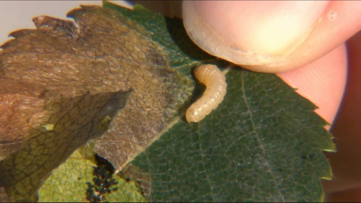 Lirfa birkiþélunnar er smávaxin og kemur sér fyrir milli laga í laufblöðum birkisins. Því er erfitt að vinna á henni, til dæmis með eitri. Skjámynd úr frétt RÚV.