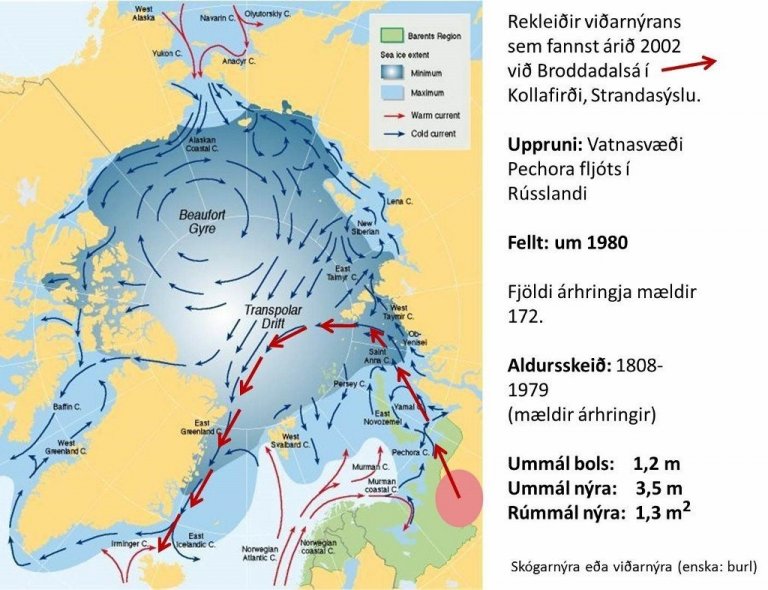 Rekleiðir hafíss á norðurheimskautssvæðinu. Broddadalsnýrað hefur borist hingað til lands frá Rússlandi eins og mikið af þeim rekaviði sem rekur á Íslandsstrendur. Kort: Ólafur Eggertsson.