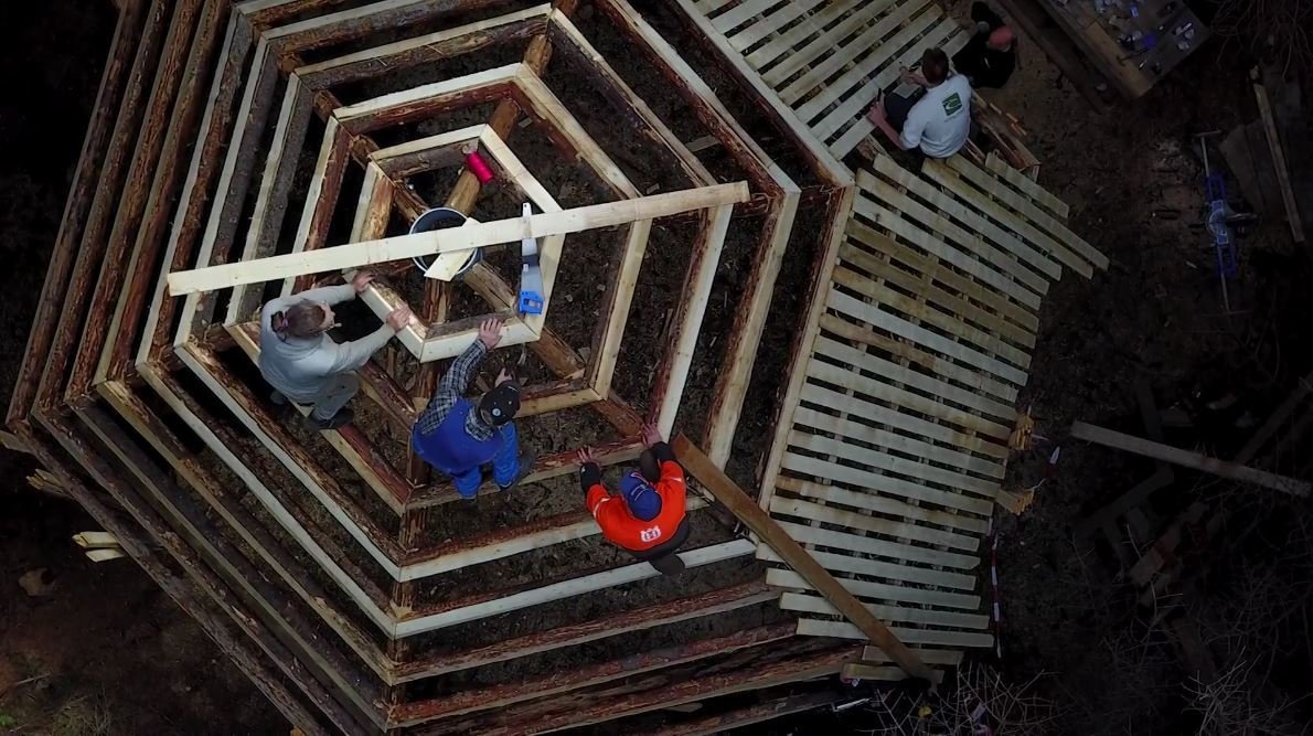 Efniviðurinn í skýlið er sitkagreni úr Haukadalsskógi sem unninn var í sögunarmyllu Skógræktarinnar í Þjórsárdal. Vinna við skýlið hófst um miðjan maí en á fallegum degi seint í júní var hóað í starfsfólk Skógræktarinnar á Suður- og Vesturlandi til að leggja hönd á plóginn við klæðingu hússins og fleiri verk. Þar tók Hlynur Gauti Sigurðsson upp efni í skemmtilegt myndband sem sýnir vel aðstæður í Hákonarlundi og lögun nýja bálskýlisins. Og eins og sést í myndbandinu unnu um fimmtán manns þennan dag að þessu þarfa verki.