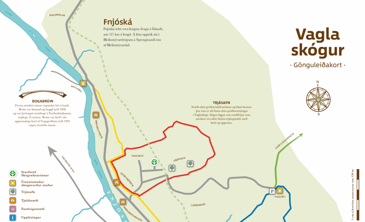 Bæklingnum nýja má hlaða niður á síðu Vaglaskógar hér á skogur is og sömuleiðis verður hann fáanlegur á starfstöð Skógræktarinnar í Vaglaskógi og í sérstökum bæklingakössum sem er að finna við upplýsingaskilti í skóginum. Upplagt er að hlaða bæklingnum niður og hafa í snjalltækinu þegar farið er um skóginn. Einnig má hlaða niður göngukortinu eingöngu sem myndskrá.