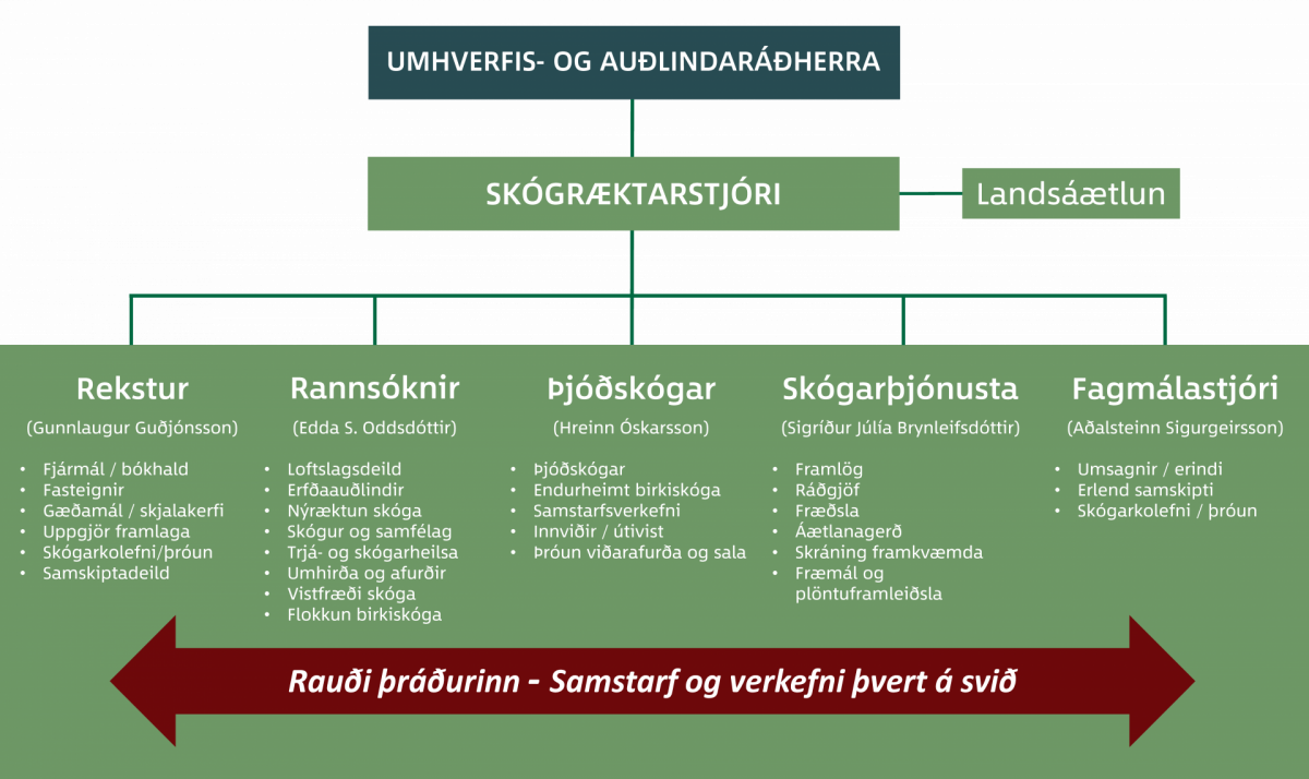 Á skipuritinu er rauð, lágrétt píla sem skiptir mestu máli. Samskipti, teymisvinna og verkefni eru þvert á svið eftir því sem hentar og án hindrana. Þröstur segir að sviðin séu ekki síló sem beini hlutunum í einn farveg. Jafnframt sé lög áhersla á að fólk sé upplýst um það sem er að gerast hjá stofnuninni, til dæmis að sviðstjórum sé alltaf kunnugt af samstarfi og nýjum verkefnum sem efnt er til. Sú breyting sem mest er áberandi á skipuritinu er að í stað skógarauðlindasviðs koma tvö svið, þjóðskógar og skógarþjónustan.