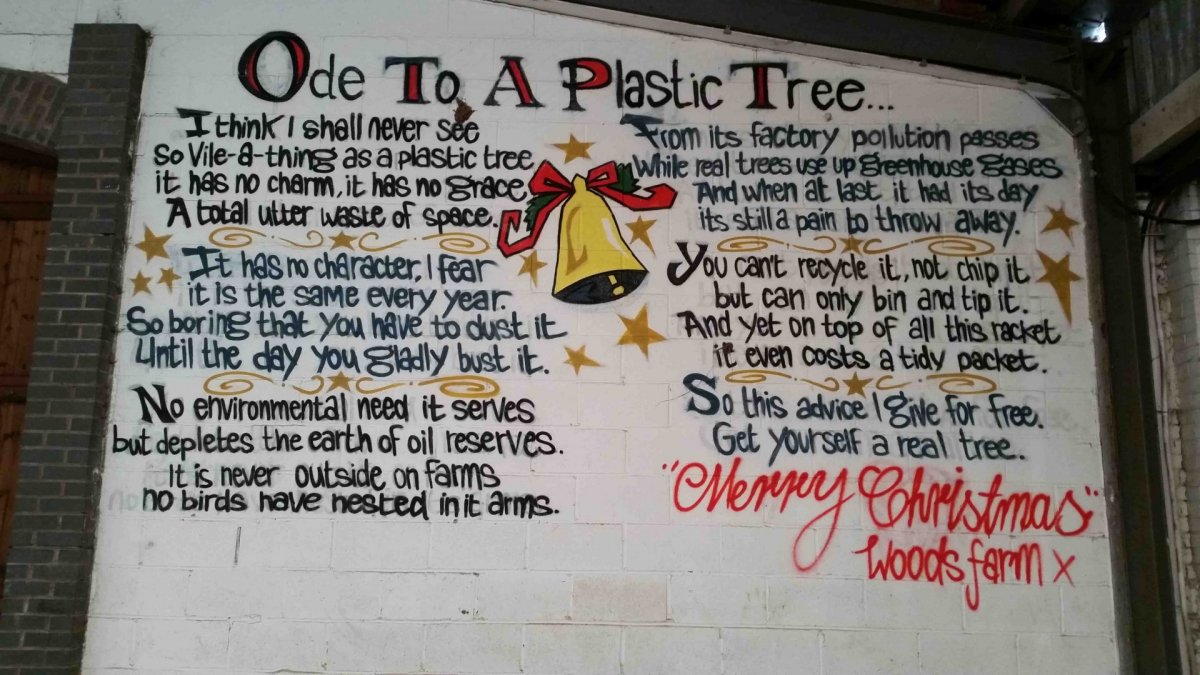 Á vegg í skemmu ónefnds jólatrjáabónda vestur í Ameríku er þessi óður til gervijólatrésins skrifaður og hvatning til fólks að velja heldur lifandi tré. Hér fylgir lausleg þýðing á þessum þarfa óði.