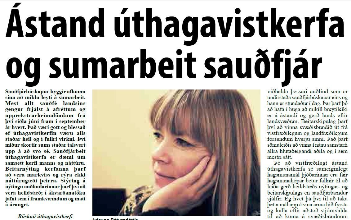 Í greininni hælir Þórunn þeim bændum sem hafa staðið sig vel við landgræðslustörf en á máli hennar má skilja að nokkur mótsögn sé þar með fólgin í því hvernig sömu bændur beita fé sínu að sumri. Enn skorti heildstæða áætlun fyrir skipulag sauðfjárbeitar að sumarlagi. Flestir sauðfjárbændur beiti enn afrétti og upprekstrarheimalönd samkvæmt gömlum hefðum. í mörgum tilfellum sé enn verið að beita fé á illa farið land og auðnir. Þá skrifar Þórunn: