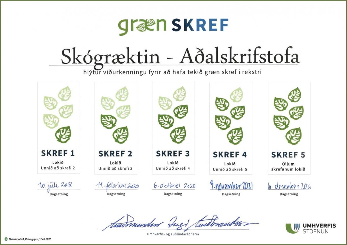 Skógræktin tók fyrsta skrefið árið 2018, skref 2 og 3 árið 2020 og það fjórða náðist í nóvember síðastliðnum. Fimmta og síðasta skrefið lýtur aðallega að miðlægum atriðum í rekstri og tekur á þeim aðgerðum sem þarf að innleiða til að byggja upp umhverfisstjórnunarkerfi hjá viðkomandi stofnun. Þar er umhverfis- og loftslagsstefna viðkomandi stofnunar mikilvægt atriði en Skógræktin gaf út slíka stefnu á síðasta ári og birti á skogur.is Úttekt á fimmta skrefinu hjá Skógræktinni var gerð í byrjun desember og viðurkenningin veitt 6. desember með undirskrift Guðmundar Inga Guðbrandssonar, fyrrverandi umhverfis- og auðlindaráðherra.