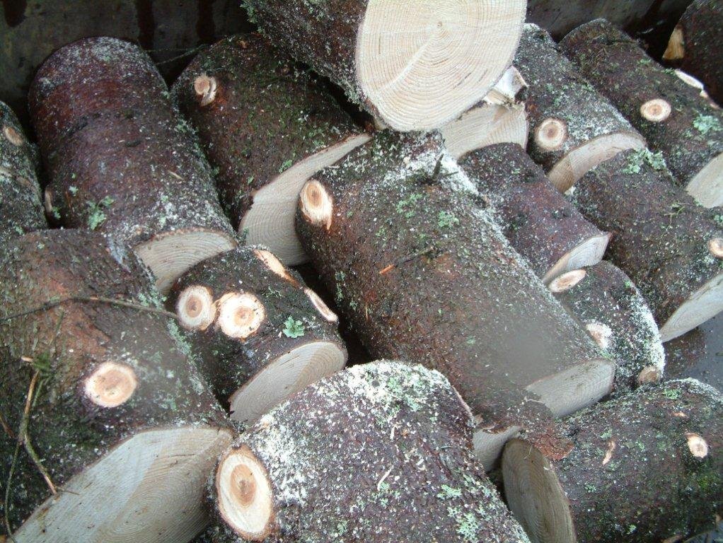 Rennismiðir sækja sér efni úr Oslóartrénu. Á miðri mynd má sjá Karl Helga, rennismið, standa við bút úr trénu en hann renndi fyrstu rauðgreniskálina á Íslandi á skógardegi í Haukadalsskógi árið 1997.