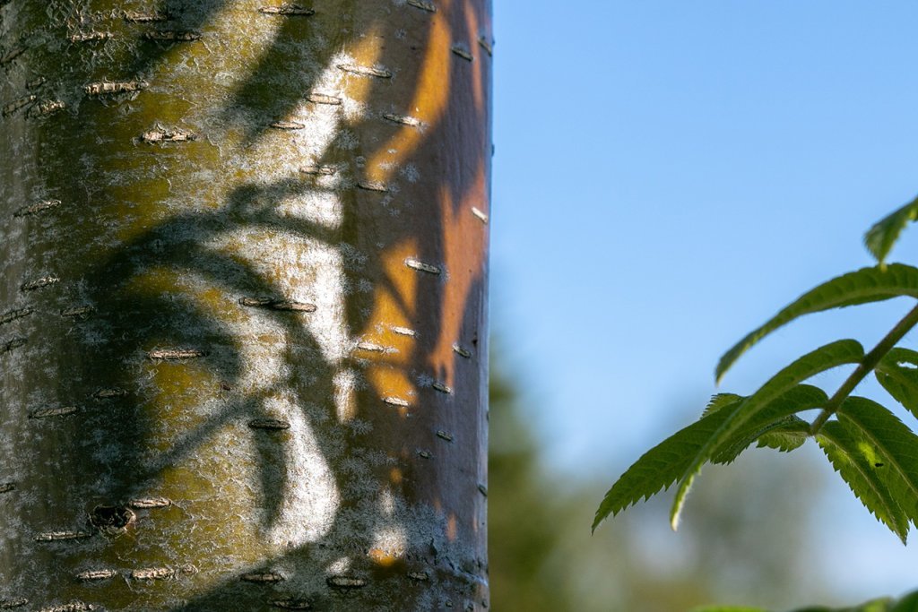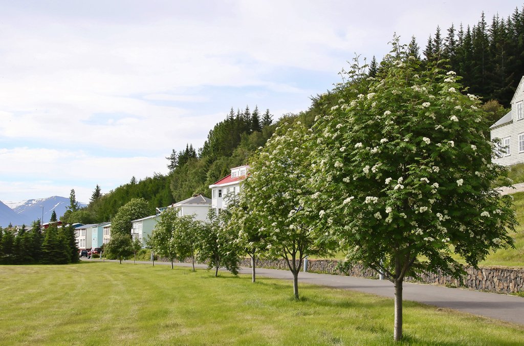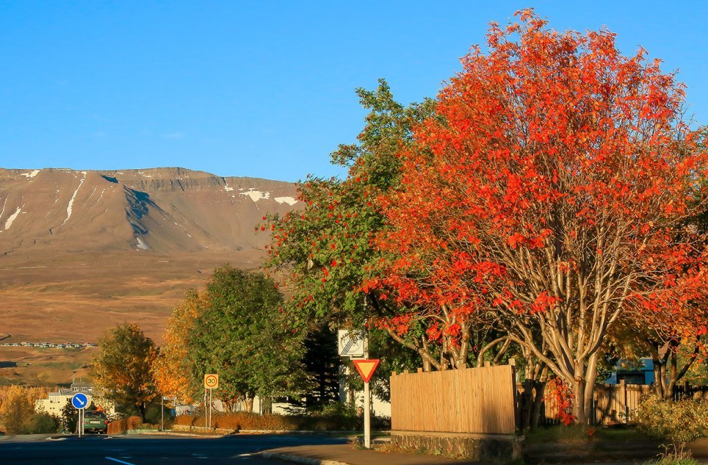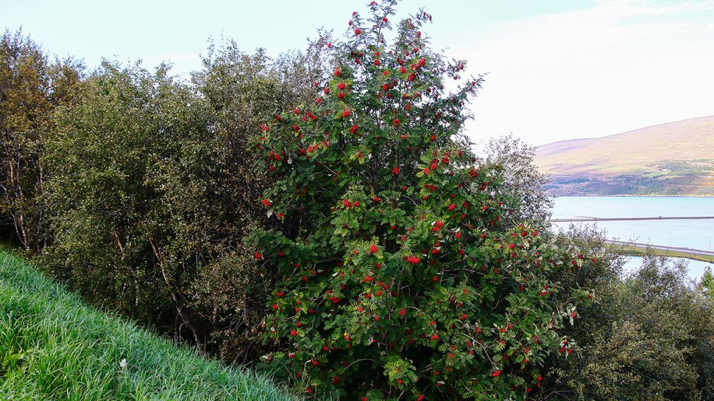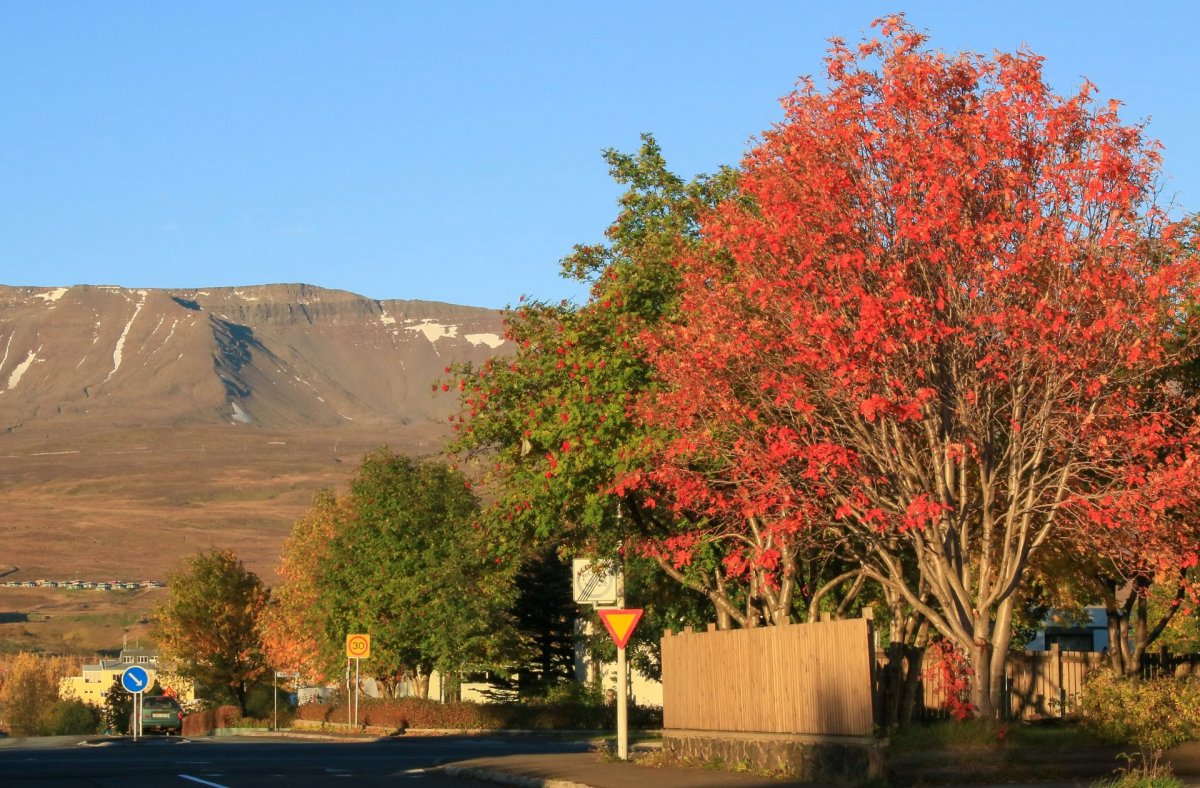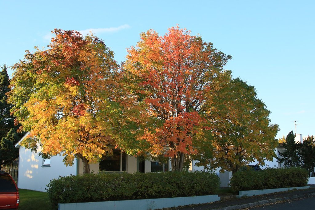 Haustlitir á reyniviði geta verið mjög fjölbreytilegir og nokkuð misjafnt hvenær einstök tré klæðast haustlitum. Þetta getur skapað mikla litadýrð þar sem mörg reynitré standa í nágrenni hvert við annað. Ljósmynd: Pétur Halldórsson