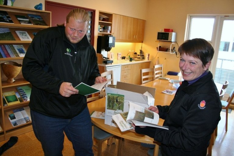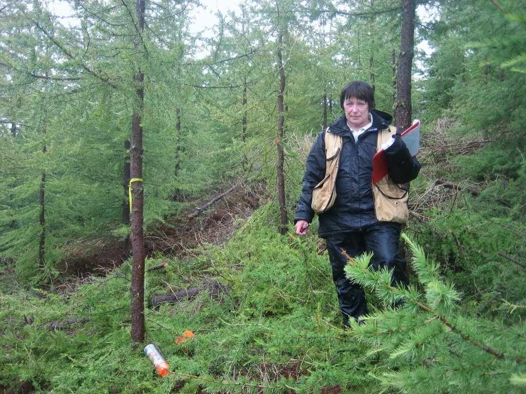 Sherry við úttekt á rigningardegi í Hvammi á Völlum.