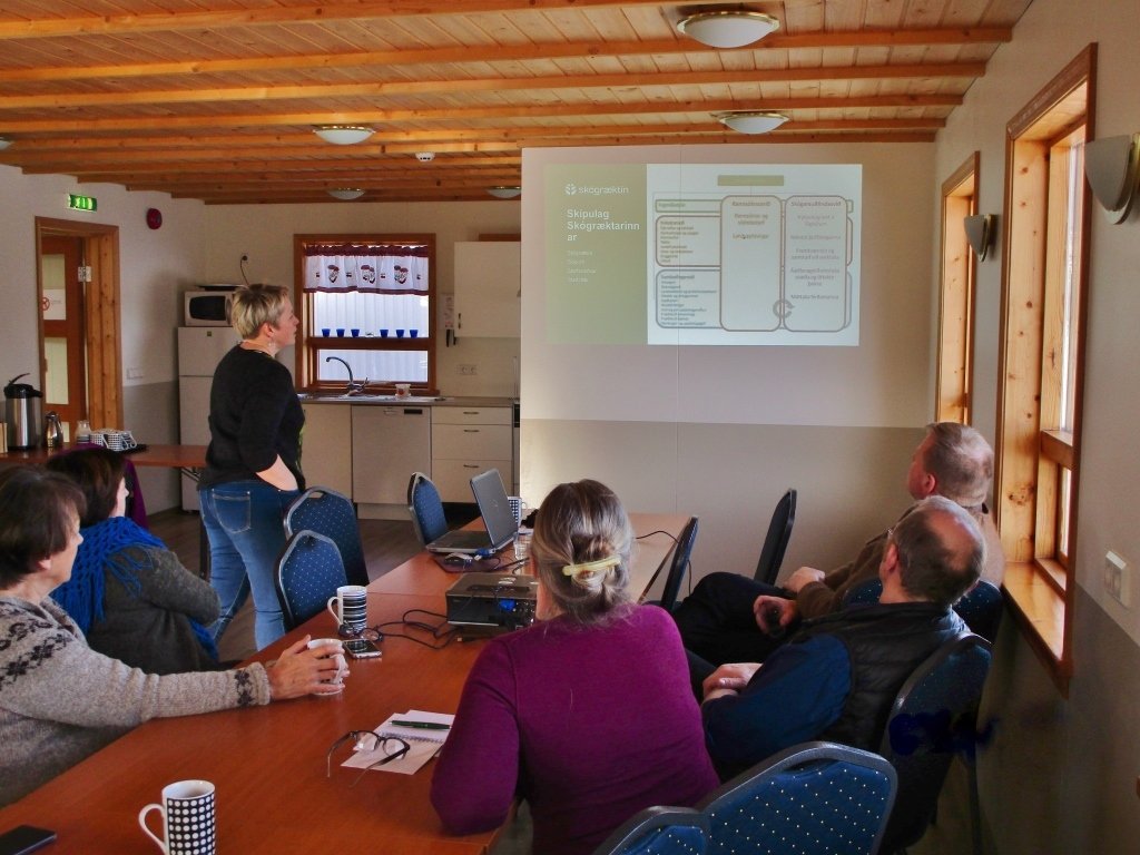 Hér kynnir Sigríður Júlía Brynleifsdóttir, sviðstjóri skógarauðlindasviðs Skógræktarinnar, skipurit stofnunarinnar og fyrirkomulag stuðnings og samstarfs við skógarbændur. Myndin er frá fundinum að Þurranesi í Dölum.