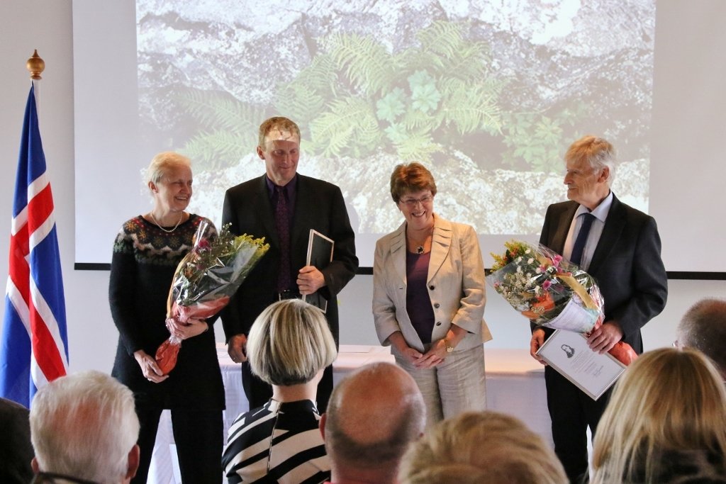 Hjónin Elisabeth Hauge og Björn Halldórsson á Valþjófsstöðum í Núpasveit við Öxarfjörð hlutu í gær verðskuldaða viðurkenningu fyrir þrotlaust starf sitt í skógrækt og annarri landgræðslu. Sigrún Magnúsdóttir afhenti þeim náttúruverndarviðurkenningu Sigríðar í Brattholti á degi íslenskrar náttúru Völundi Jóhannessyni sem sýnt hefur mikla elju við ræktun í yfir 600 metra hæð yfir sjó á austanverðu hálendi Íslands.
