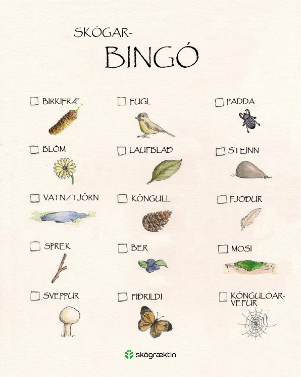 Skógræktin hefur gefið út skemmtilegan leik sem fjölskyldan getur spreytt sig á í skógum landsins í sumar. Leikurinn kallast skógarbingó og snýst um að finna ýmis fyrirbrigði í skóginum og haka við líkt og á bingóspjaldi.