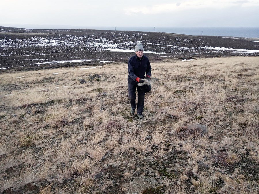 Björn Halldórsson, bóndi á Valþjófsstöðum í Núpasveit, dreifir birkifræi á uppgræðslulandi. Ljósmynd úr Bændablaðinu.