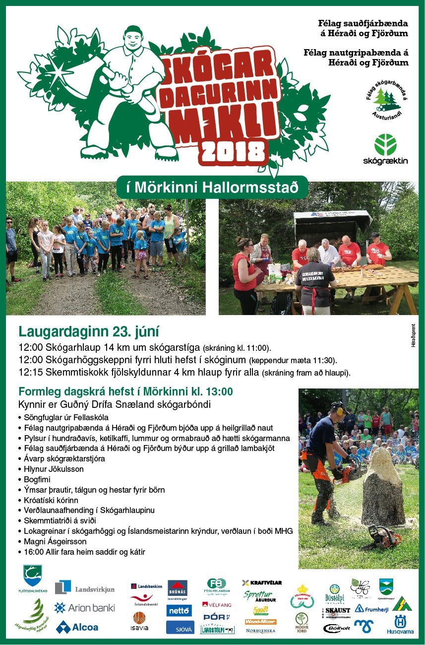 Skógarhlaupið er að venju upphafsatriði Skógardagsins mikla. Keppendur í fjórtán kílómetra hlaupi um skógarstíga verða ræstir klukkan ellefu. Klukkan tólf hefst fyrri hluti skógarhöggskeppni en stundarfjórðungi síðar leggja hlauparar í fjögurra kílómetra skemmtiskokki af stað. Skemmtidagskráin byrjar svo klukkan eitt í Mörkinni, fjölbreytt að venju með skemmtiatriðum, keppni í skógarhöggsgreinum, tónlistarmennirnir Hlynur Jökulsson og Magni Ásgeirsson stíga á svið, Króatíski kórinn syngur, grillað verður naut og lamb, eldað ketilkaffi, bakað pinnabrauð og vöfflur svo eitthvað sé nefnt. Sjá nánar á auglýsingunni sem hér fylgir.